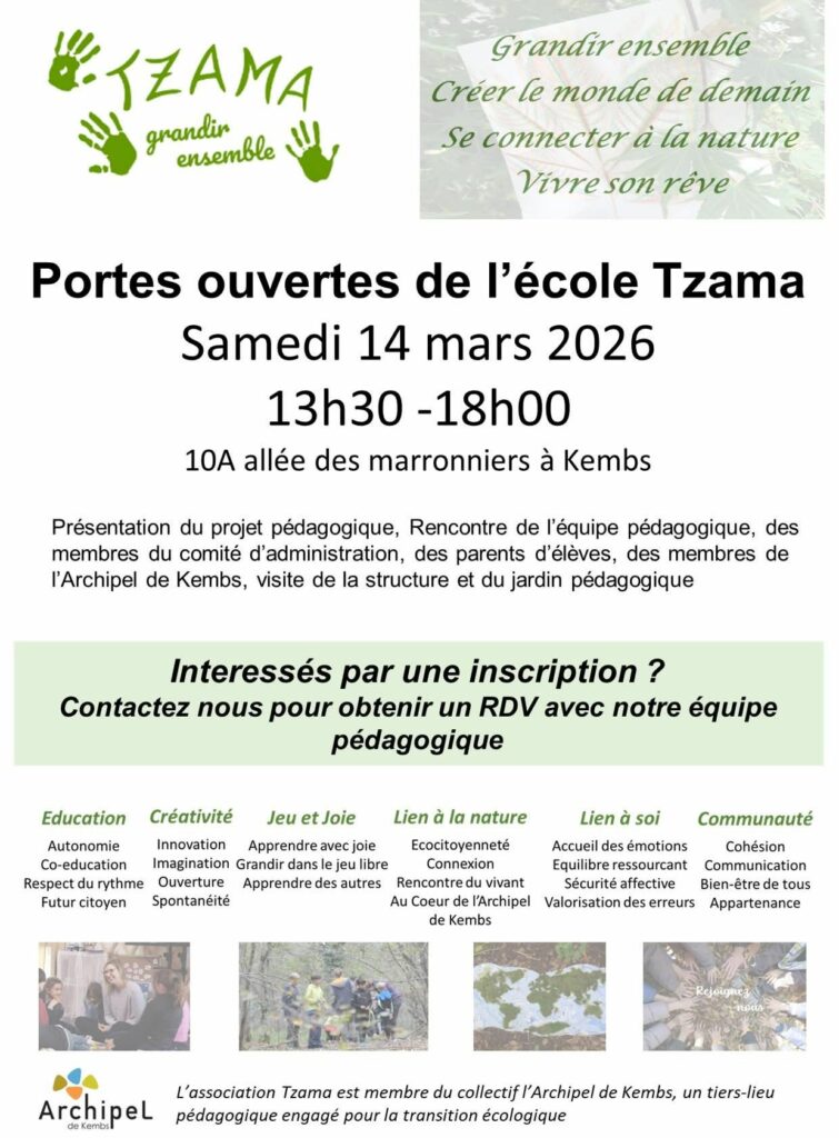 Tzama c’est le développement d’un tiers-lieu pédagogique appelé Archipel de Kembs en collaboration avec les associations Colibris 68, G’Rhin d’Sel et le groupement d’achat solidaire GASPR. Ce magnifique projet a été sélectionné comme territoire d’expérimentation pour la transition écologique et solidaire en 2021 et vient de recevoir le label ecocert en fevrier 2022.